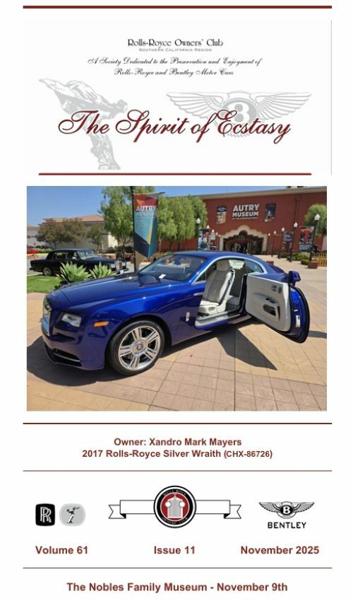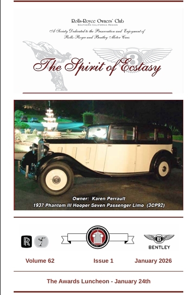 The Spirit of Ecstasy is the monthly newsletter of the Rolls-Royce Owners’ Club, Southern California Region. This publication has been well recognized by our National organization, and has received the coveted McFarlane Trophy five times. This publication is the life blood of the organization, reporting on monthly events with who attended and which beautiful PMC’s they drove, articles on upcoming events, technical articles to help members keep their PMC’s in tip top condition, and well as special articles on new members and services available to our members.