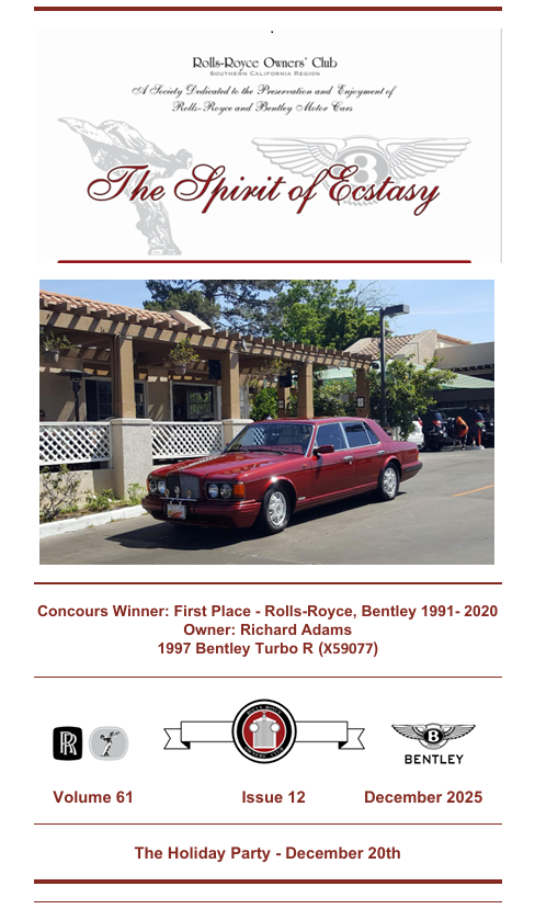 The Spirit of Ecstasy is the monthly newsletter of the Rolls-Royce Owners’ Club, Southern California Region. This publication has been well recognized by our National organization, and has received the coveted McFarlane Trophy five times. This publication is the life blood of the organization, reporting on monthly events with who attended and which beautiful PMC’s they drove, articles on upcoming events, technical articles to help members keep their PMC’s in tip top condition, and well as special articles on new members and services available to our members.